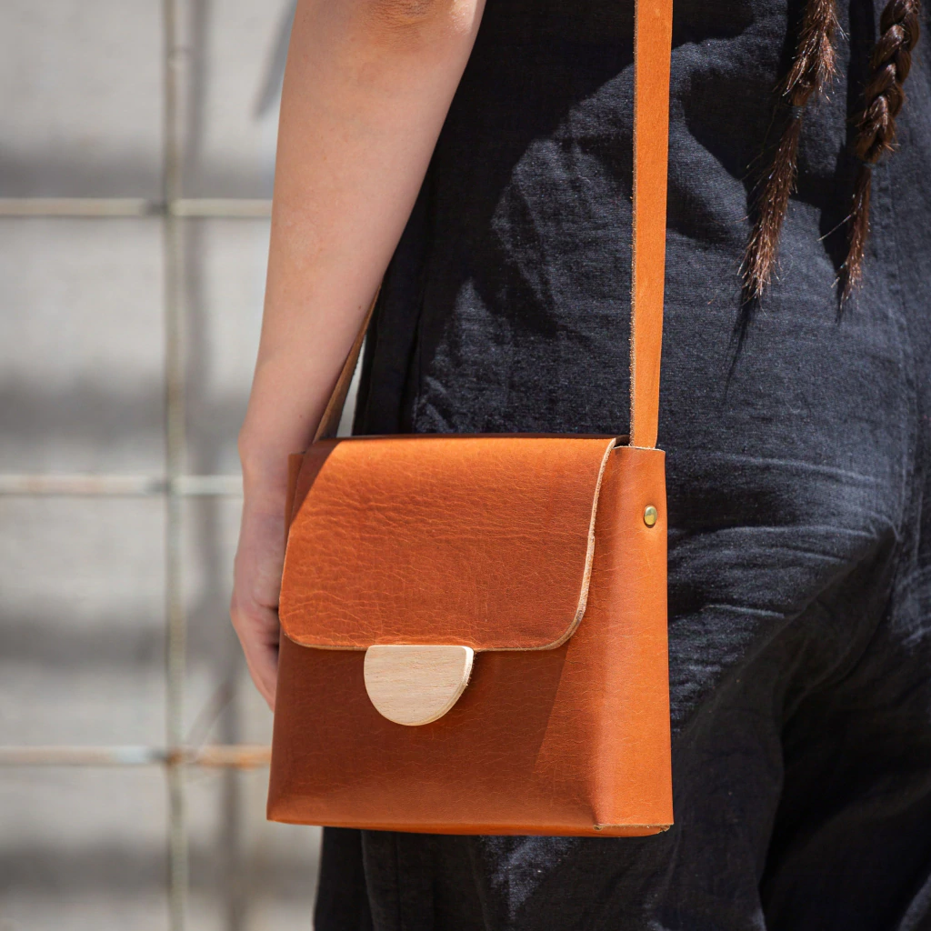 Bandolera de cuero de curtición vegetal, creada por pliegues sin costura y con un detalle único en madera.